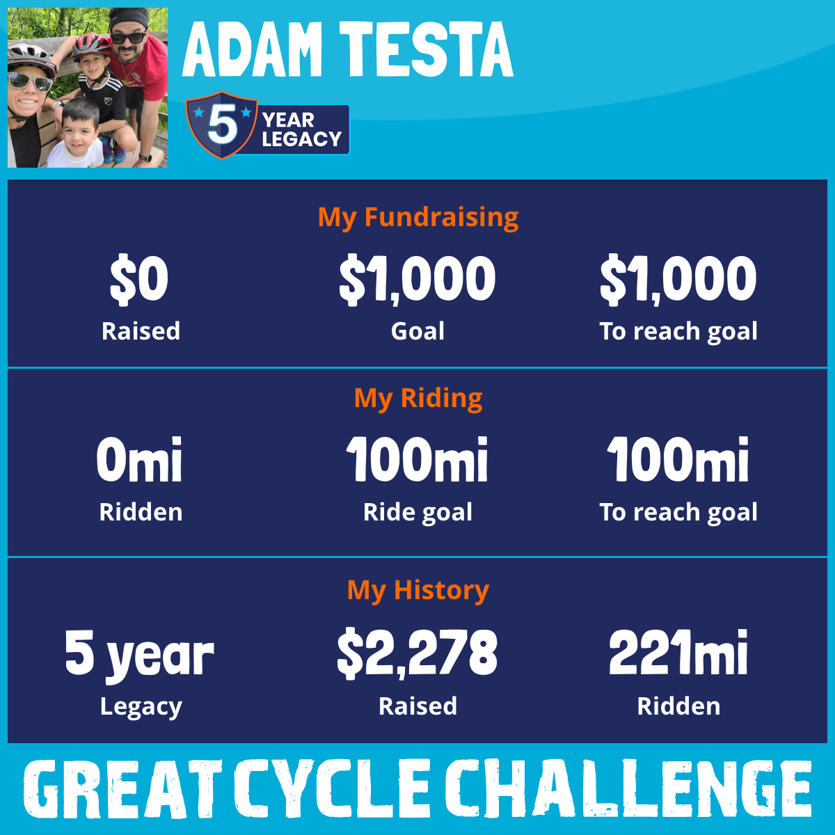This September, I am taking part in my 5th year of the Great Cycle Challenge to fight kids' cancer! I appreciate all of those who have helped along the way. This year I set another goal of 100 miles to hopefully reach and surpass.
