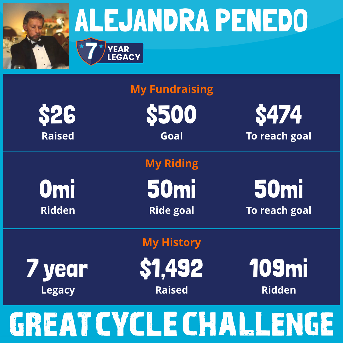 I am riding in honor of my dad, Luis A. Penedo, who battled cancer from the age of 5 to 12. He lived his life with gratitude and kindness, always striving to be a good person to everyone around him. After 50 beautiful years of health, God called him home, leaving us with cherished memories. In the 10 years since his departure, my mission has been to help more children have the same opportunity for a full and happy life as my dad did. I am raising funds through my challenge to help these kids and support the Children's Cancer Research Fund. Your donation will allow them to continue their work to develop lifesaving treatments and find a cure for childhood cancer. Please support me by making a donation to give these kids the brighter futures they deserve. Your support will change little lives. Thank you. 🌟 Alejandra