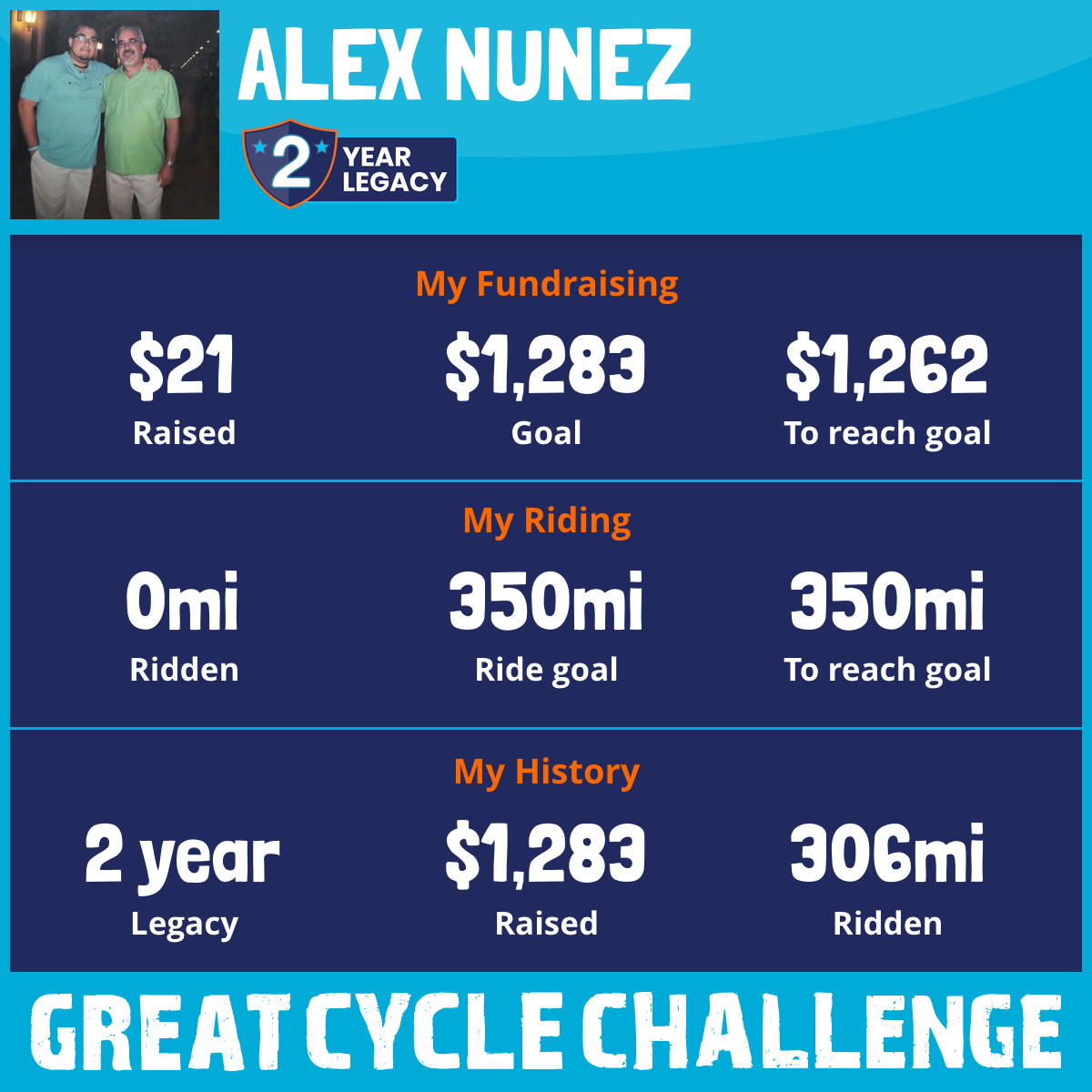 I'm doing this bike challenge in memory of my dad. He was my hero and my biggest supporter. This ride is a chance for me to feel close to him again. The miles I cover are a small way to honor his life and all the joy and love he brought to the world. I'm so grateful for every moment we had together. Dad, This one is for you.