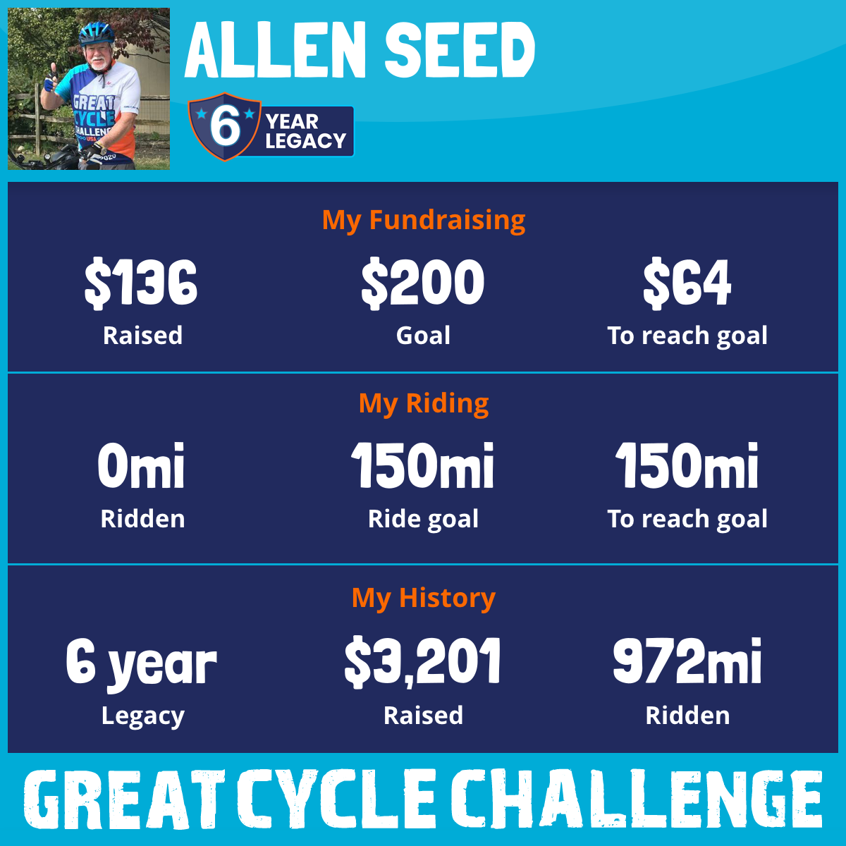 I'm riding for all the kids, parents, family, and friends affected by cancer. I'm also honoring the memory of my sister, niece, and cousin. This is my fifth Great Cycle Challenge fundraising event and I'm excited about achieving my goals doing something I enjoy, riding my bike!