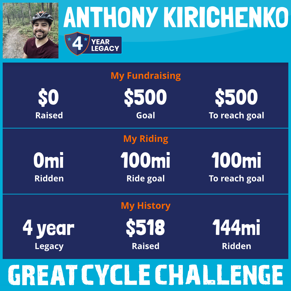 I started this challenge 3 years ago as a way to do my part to raise awareness for the kids and families fighting through childhood cancer. Now as a father I understand deeper the importance every ounce of support and how far it goes. My goal is to continue riding and raising donations to help anyone in need!