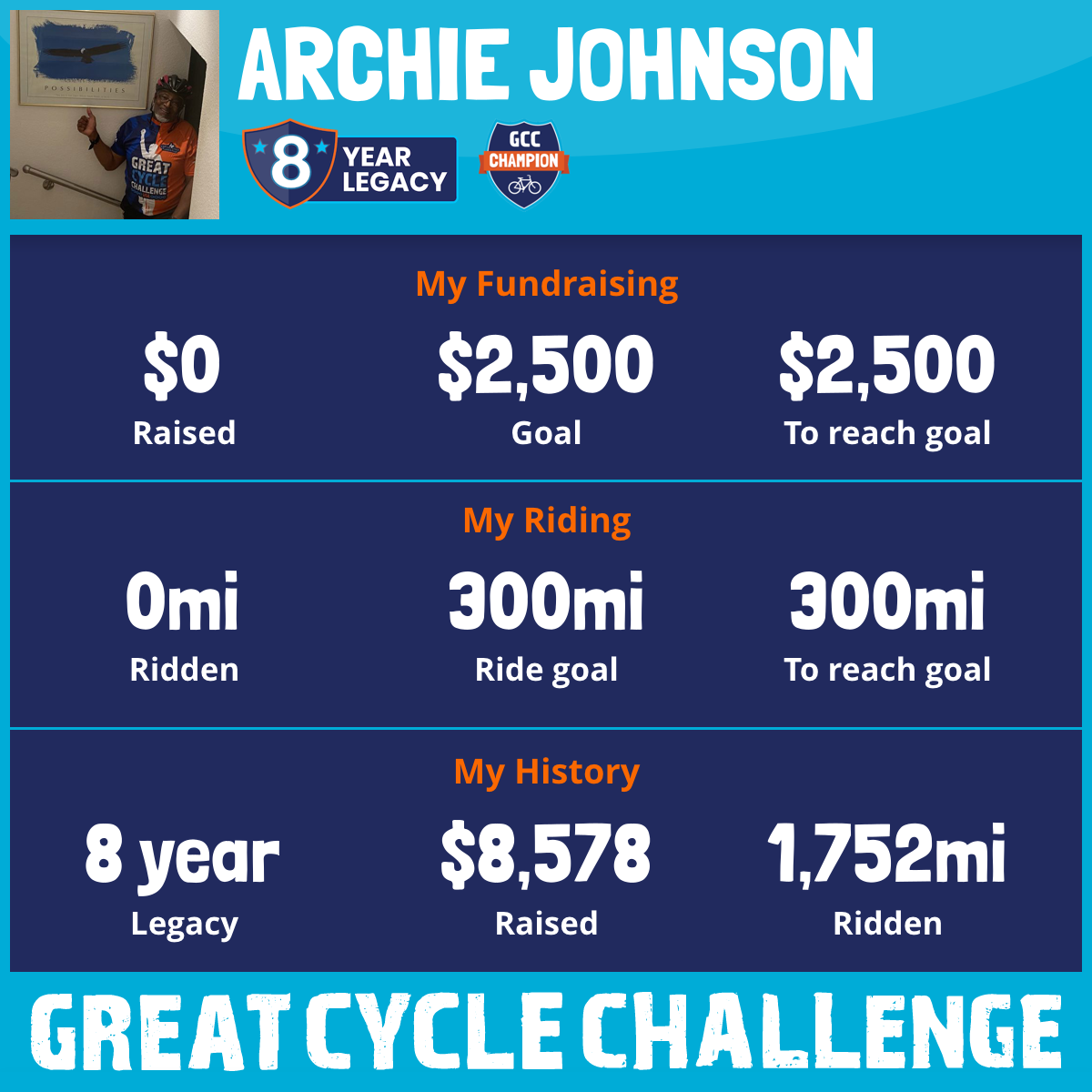 This year, I’m taking on the Great Cycle Challenge and riding 300 miles to raise $2,500 in support of kids fighting cancer. I’m riding in memory of my beloved wife, Brigitte, who I lost at the beginning of this year. She was always my greatest supporter, and I know she’s smiling down on me from the best seat in the house. Brigitte loved children dearly, and I can’t think of a more meaningful way to honor her than riding for this cause. Every mile I ride is for her, and for the kids who need our help. Please consider sponsoring me and supporting this challenge. Together, we can fight kids’ cancer and save little lives. Thank you and God bless you 💙
