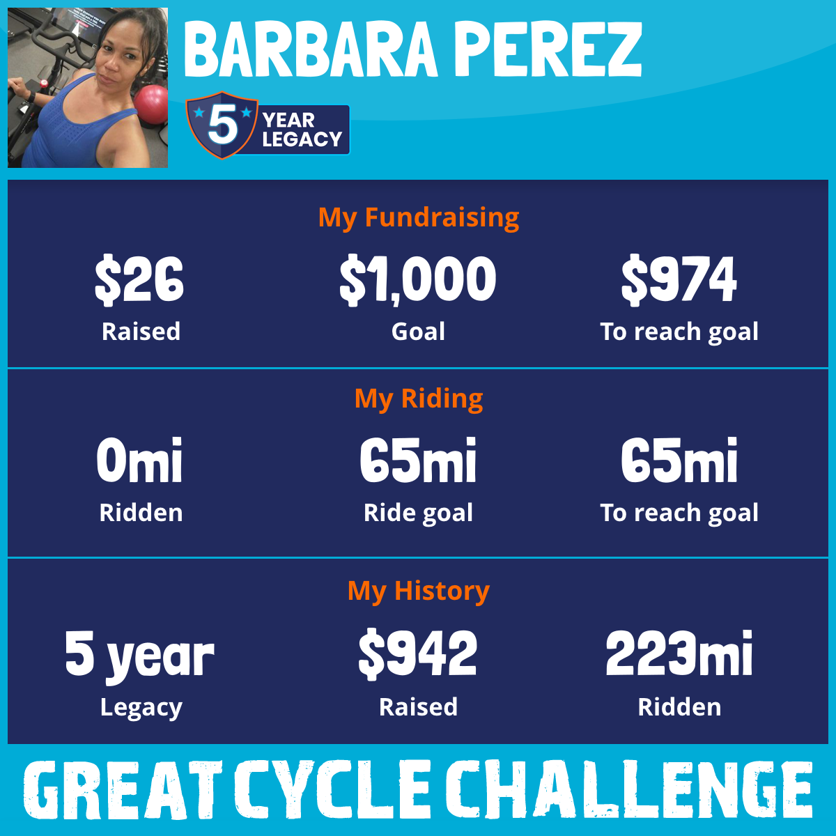 My 5th year participating in the Great Cycle Challenge! I truly believe that this is one way of caring for others as God calls us to do. My goal is to pedal 65 or more spin cycle miles this September at the hotel gyms during my work travel, and to raise at least $1000.