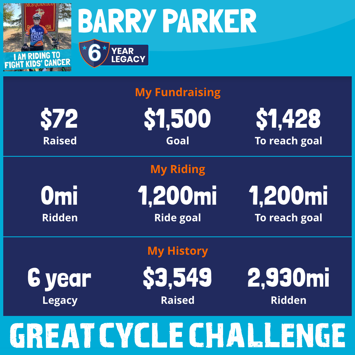 I am riding 1,500 mi in memory of Kids Cancer. Please sponsor me and support my challenge to fight kids' cancer and save little lives.