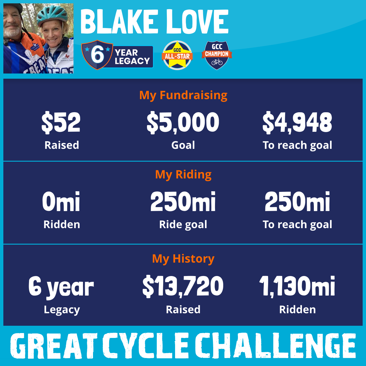This September, I am taking part in the Great Cycle Challenge to fight kids' cancer! This is my 6th year of participating and I have increased my goal to 300 miles with Kathy's help and increased my goal to raise $5000.00 with your help.