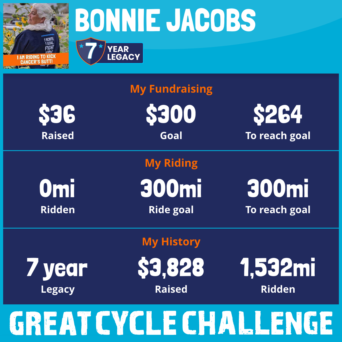 The Fund Raising Page will be open until October 31. To make a donation, view my fundraising page: www.greatcyclechallenge.com/Riders/BonnieJacobs or go to my FB fundraising page.