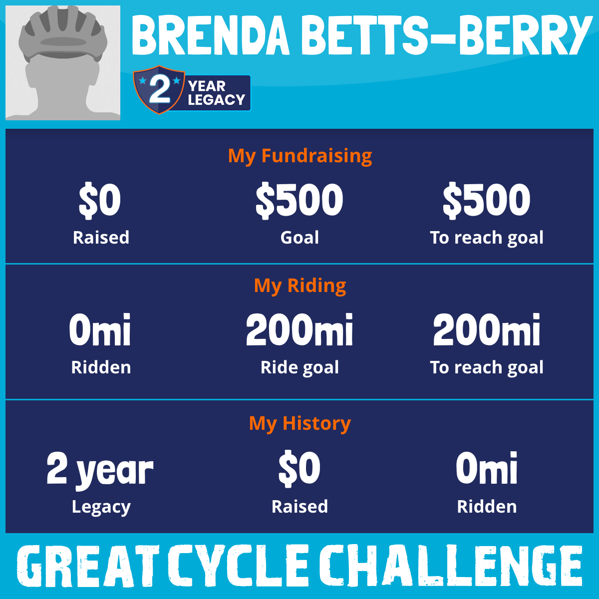 I am riding 200 mi for Brenda. Please sponsor me and support my challenge to fight kids' cancer and save little lives.