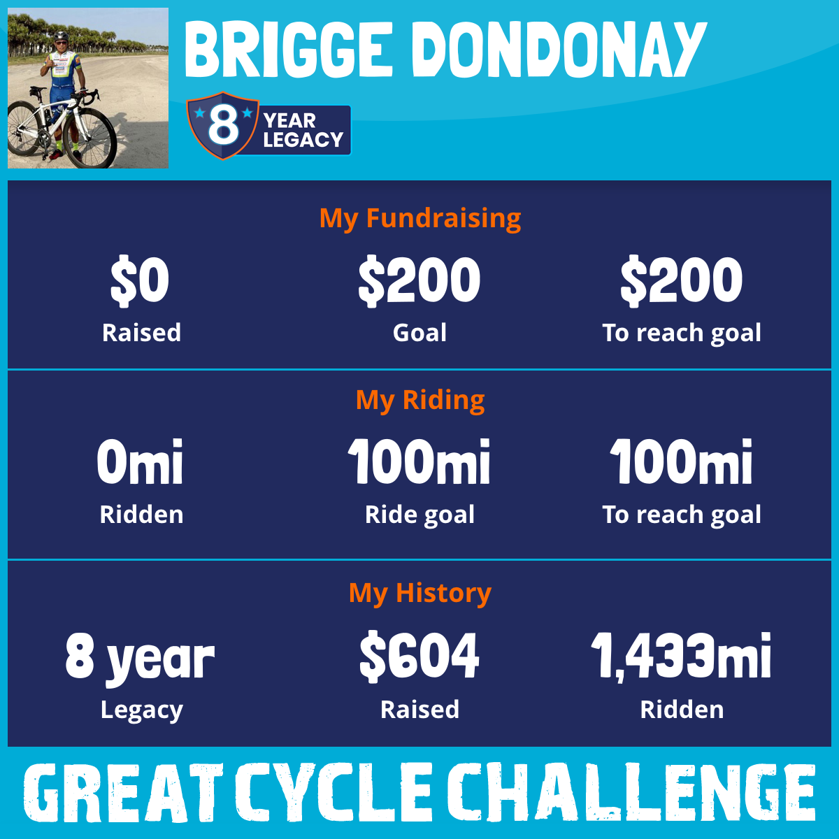 I am riding 100 mi in memory of Bing Dondonay. Please sponsor me and support my challenge to fight kids' cancer and save little lives.