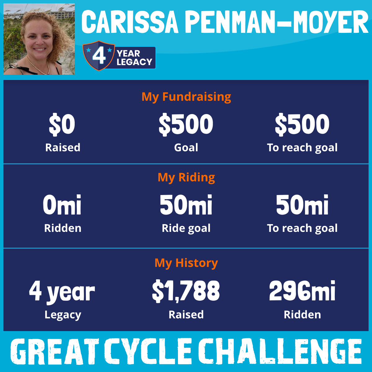 I am choosing to complete the Great Cycle Challenge in memory of my little cousin Catherine. She fought breast cancer very bravely for a few years but unfortunately lost her battle in June of 2019. She was only 26. Throughout her fight she never lost her zest for life, her smile or her contagious laugh! I miss you little cousin! 💗