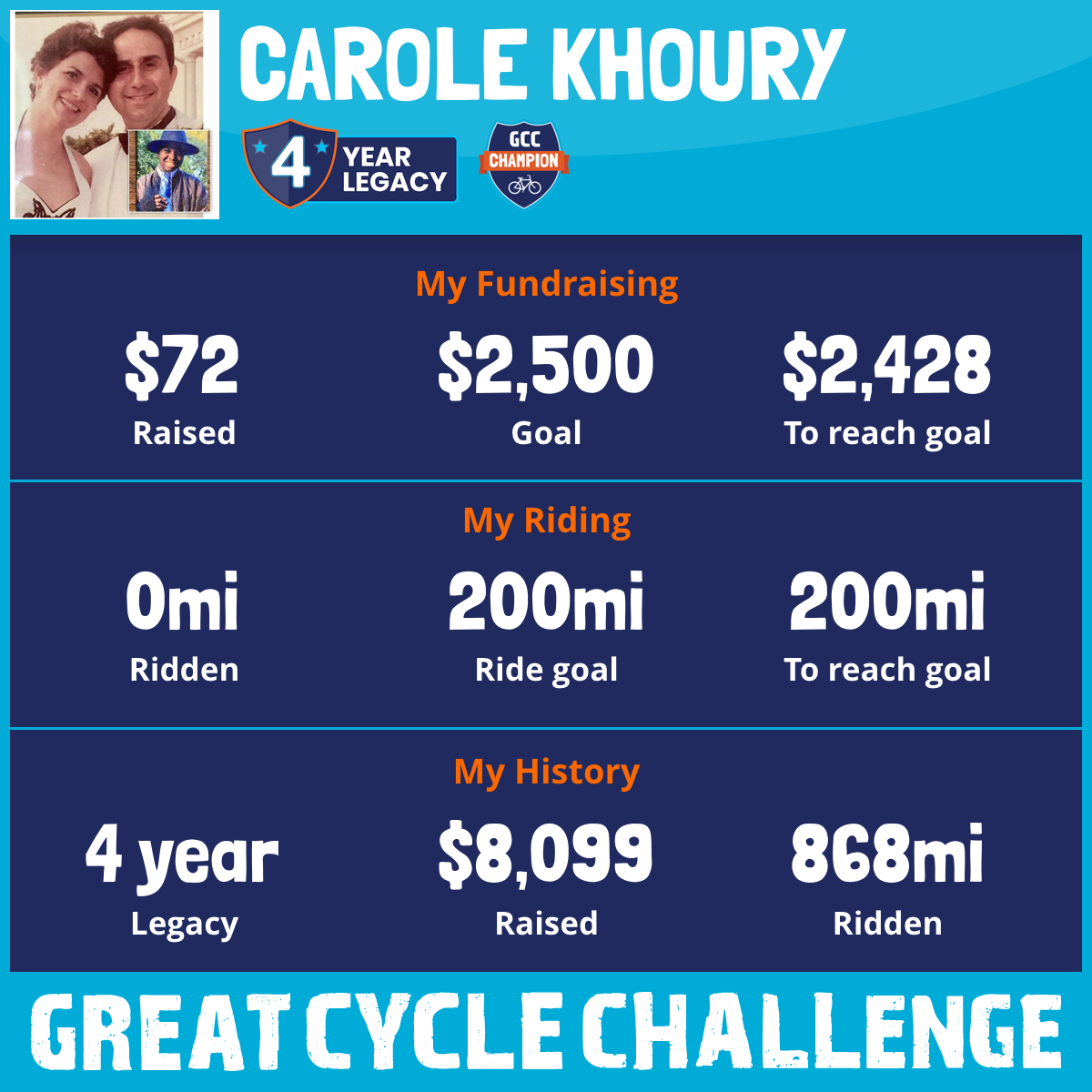 I am riding in memory of 2 special people. Always, my late husband, Paul, who lost his battle in 1998. I am also riding in memory of a precious student, Tony, who lost his battle in 2021. We need to find the cure!