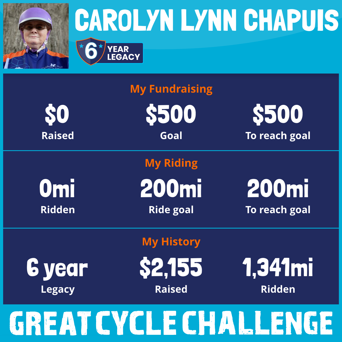 I am riding 200 mi for Carolyn Chapuis. Please sponsor me and support my challenge to fight kids' cancer and save little lives.
