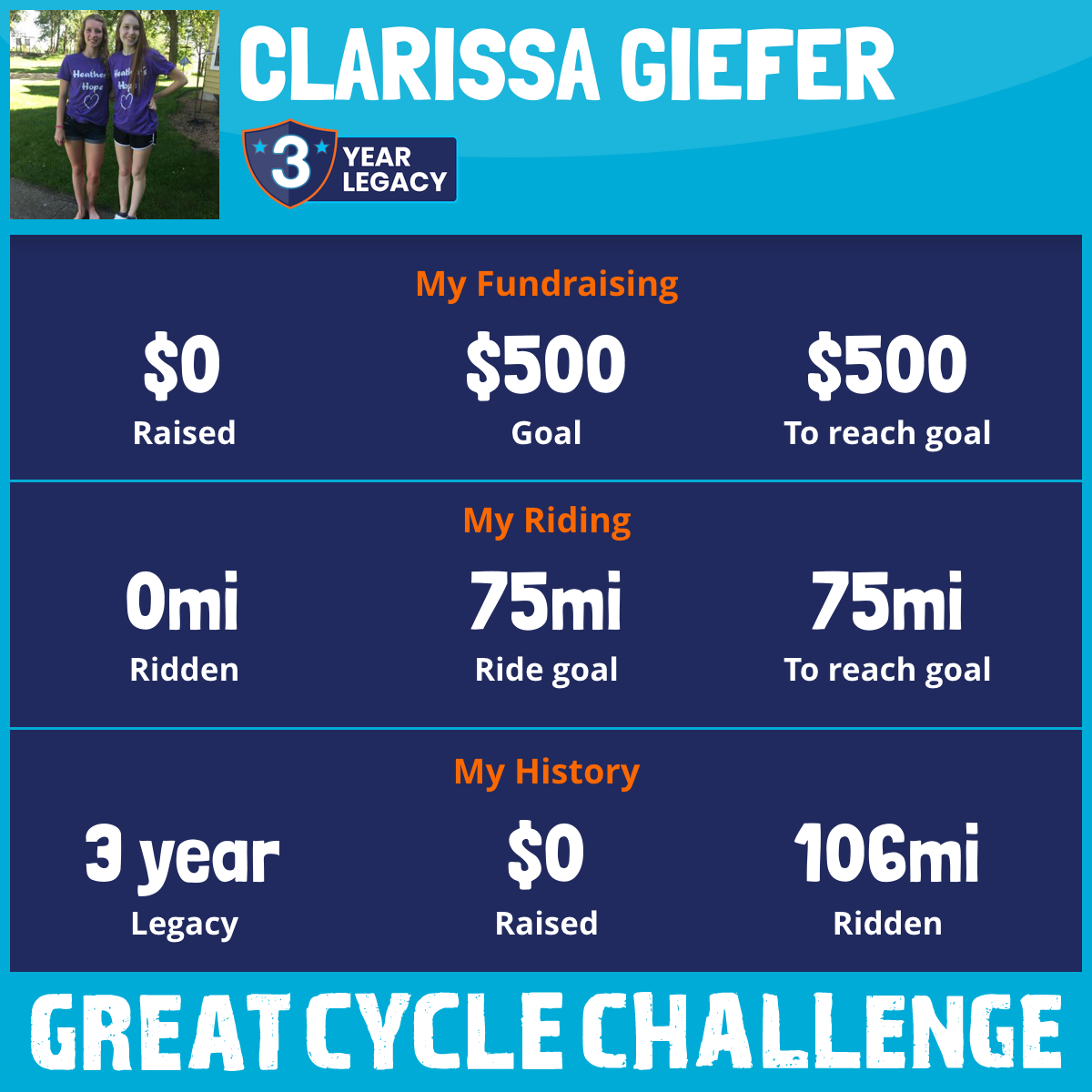 I am riding 75 mi in memory of Heather Giefer. Please sponsor me and support my challenge to fight kids' cancer and save little lives.