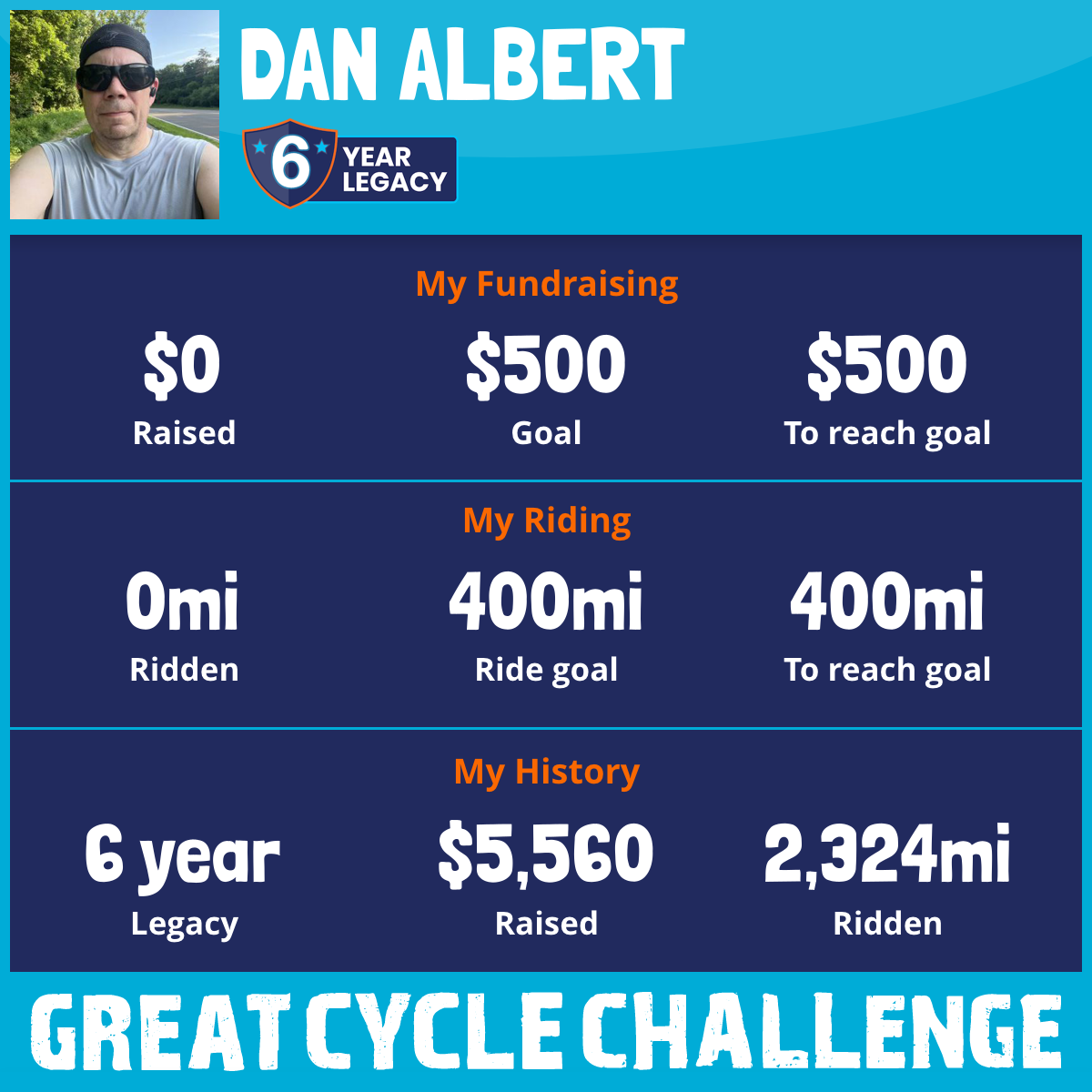 This year will be my 6th year participating in the Great Cycle Challenge. I am riding for my Father-in-Law Richard Kruzel, Uncles Roger and Gordie, family friends Carissa Blanchard, Sarah Etelman, and sadly this year Christine Gabriel. All of these dear people passed away due to cancer. One of the true survivors is Joshua Abbott and Anne Link who overcame brain cancer!! For those who have passed, may you all rest in peace. I do this in loving honor and memory of all of you! Joshua Abbott and Anne Link , keep up the great fight!!! You are truly inspiring!!! I am dedicating this year's effort to my late wife, Lana Albert, who battled PKD Kidney failure valiantly for 15 years who passed away on May 10th, 2025.