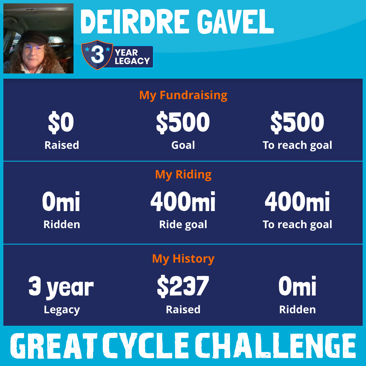 I am riding 400 mi in memory of my loved one, Priscilla. Please sponsor me and support my challenge to fight kids' cancer and save little lives.