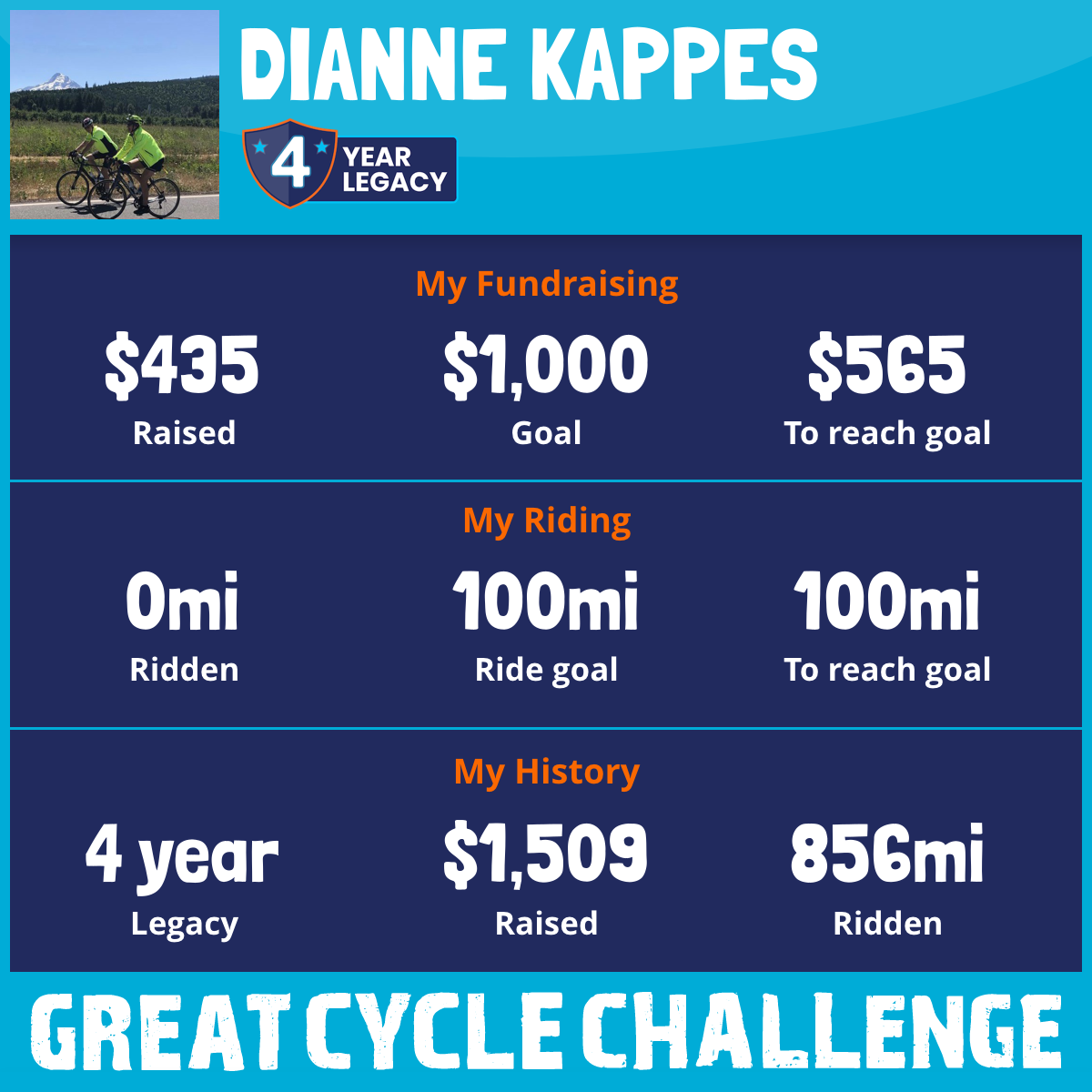 I am riding in memory of my husband Denny who left us way too young. Here we are cycling in sync with Mt. Hood in the background. This image of him being right along side me will guide me as I cycle and raise funds to fight pediatric cancer.