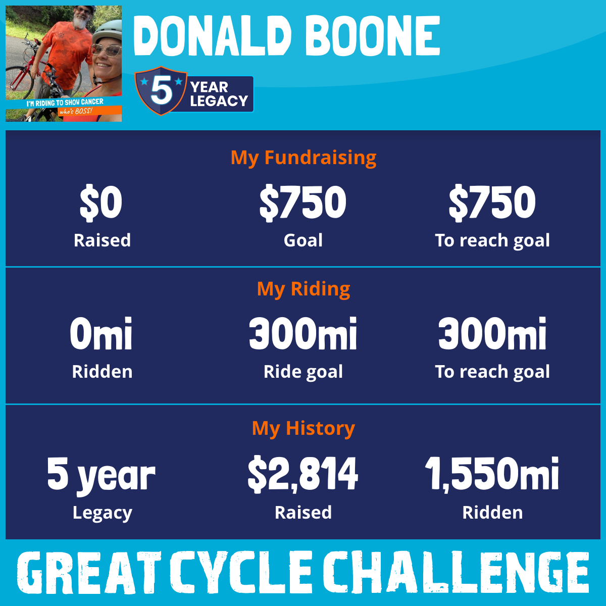 I am riding in remembrance of Dan Alley, my father-in-law, who lost his earthly-life this year to cancer. It was not discovered in time for treatment. He was always light hearted, a positive role-model, loved his family and sought to reflect Christ in all he did. I am also riding in celebration of another cancer-free year for my Mom, Judy, who is a cancer survivor. I pray that you will help fund the families of children going through cancer diagnosis and treatment.