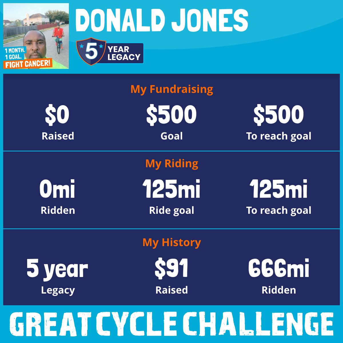 I am riding 125 mi for Sharon Jones(wife). Please sponsor me and support my challenge to fight kids' cancer and save little lives.