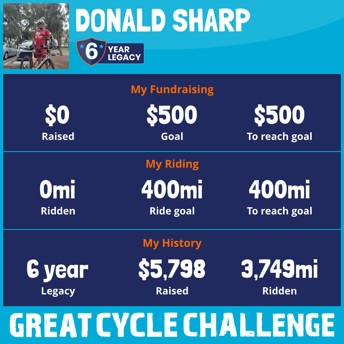 I am riding 400 mi for Donald sharp. Please sponsor me and support my challenge to fight kids' cancer and save little lives.
