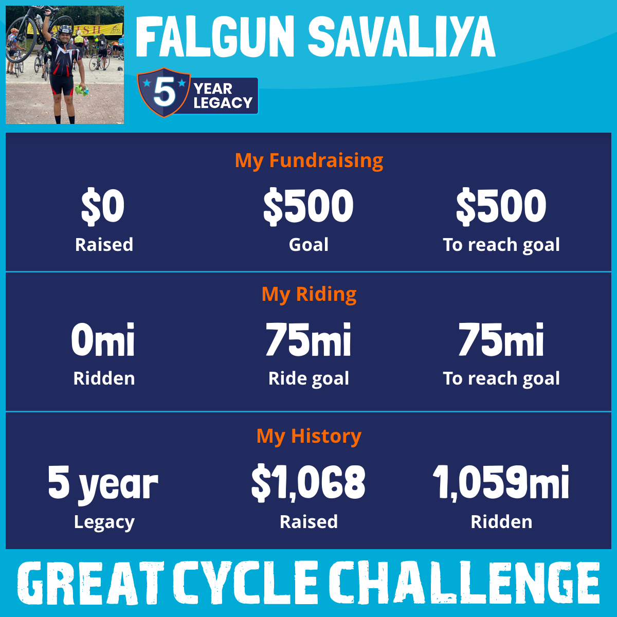 I am riding 75 mi for Sudhir Patel. Please sponsor me and support my challenge to fight kids' cancer and save little lives.