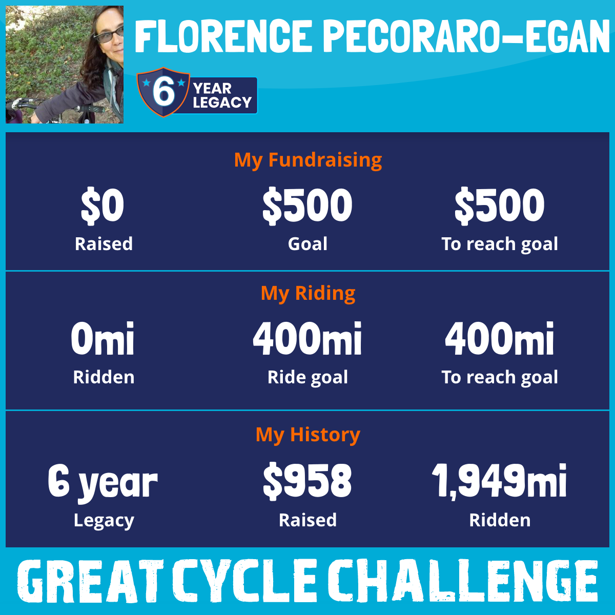 I am riding in memory of my brother, Vincent, who passed away in 1973 due to Acute Leukemia. Back then, there were less treatments available and he didn't have Recreational Therapy to better his quality of life. I remember him watching the kids outside playing while he tried to stand up from is wheelchair. I founded Fun For Cure, Inc. to benefit children like him. He was diagnosed at age 7 and passed away on September 20th at age 9... I will forever pray for, support, and strive to help other children with cancer. I pledge to participate in the Great Cycle Challenge every year from now on, God willing, and I pledge to devote my future work to raise awareness for children with cancer and for all children in need. My pledge includes raising awareness via Great Cycle Challenge and other organizations such as Fun For Cure, Inc., who actively and directly advocate for children like my brother, on a daily basis! You can donate here and you can also support my 501(c)(3) nonprofit that brings FUN into the lives of children with special and medical needs. Together we help combat any negative experiences before they occur! The journey is the goal! Visit us at www.funforcure.org Thank you, Florence