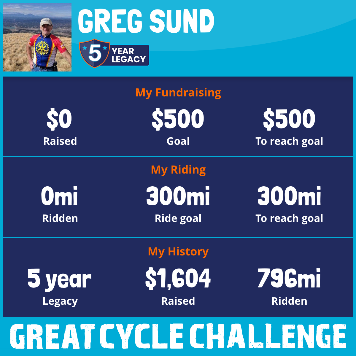 I am riding 300 mi for Greg Sund. Please sponsor me and support my challenge to fight kids' cancer and save little lives.