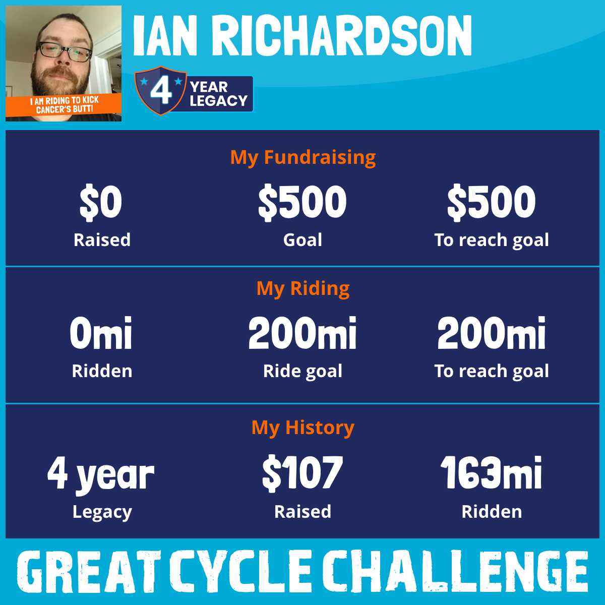 This is my third year riding with The Great Cycle Challenge, and I have loved every moment of it in the past. This year I ride again, to raise money and awareness of our cause. We will stamp out childhood cancer one day, and it starts with the work we are doing now. Won't you please give? Every single dollar matters, and it's everything for these children. Not only does your money go to fund research to eliminate childhood cancers, the research they've done in the past has gone on to save mothers, fathers, siblings, and grandparents. We can do this! We just need your help. I won't allow the heart attack I had in March 2021 to stop me. I'm going to peddle through each and every 500 miles of this trek. Granted, I have upgraded to an e-bike with peddle assist. I can't go forcing myself into another heart attack like I did riding my normal bicycle.