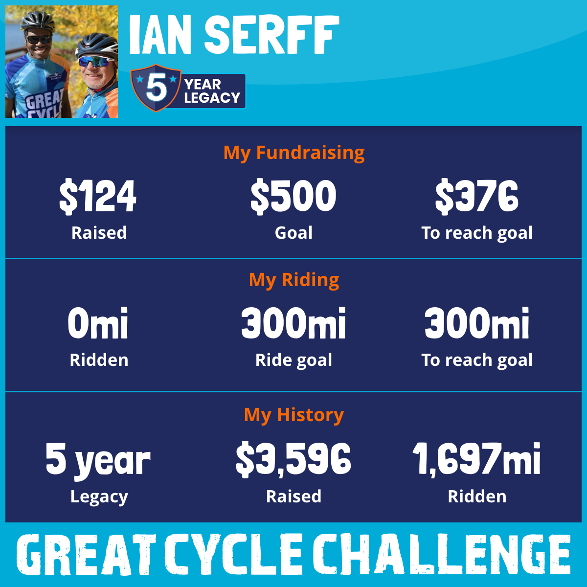 This Summer, my son Isaiah and I are taking part in the Great Cycle Challenge to fight kids' cancer for my 5th year!