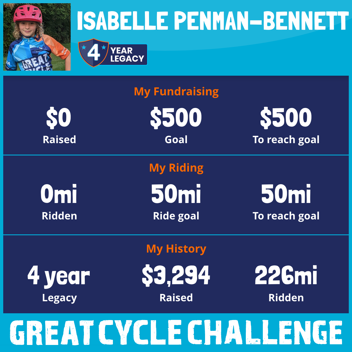 I am riding 50 mi for Abigail Bennett. Please sponsor me and support my challenge to fight kids' cancer and save little lives.