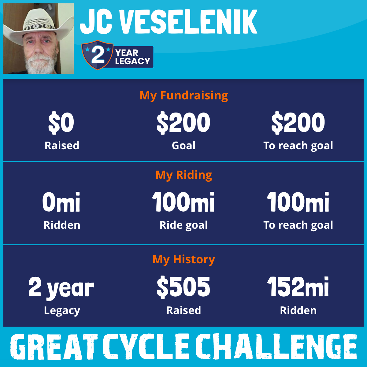 I am riding 100 mi for JC. Please sponsor me and support my challenge to fight kids' cancer and save little lives.