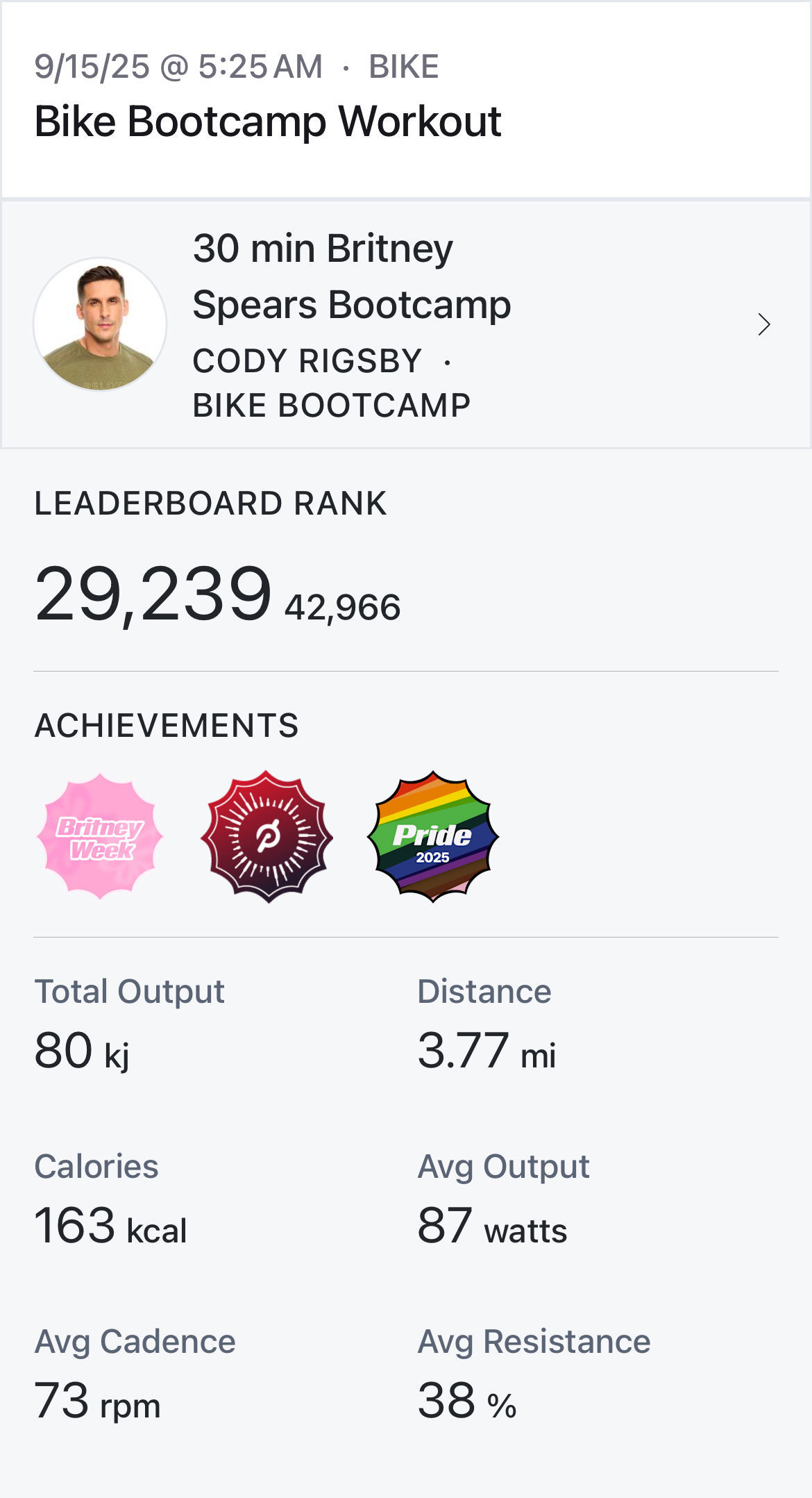 3.8 mi ride - 30 min Peloton Bike Bootcamp - Monday, September 15, 2025