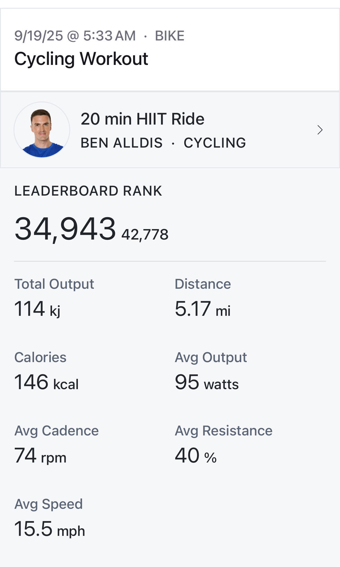 5.2 mi ride - 20 min Peloton HIIT Ride - Friday, September 19, 2025