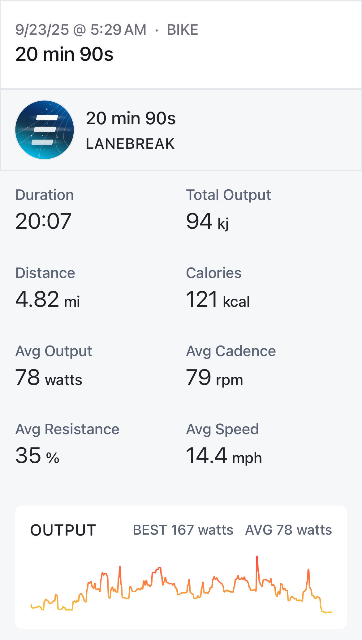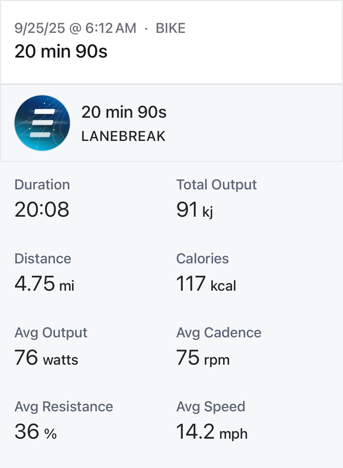 4.8 mi ride - 20 min Peloton Lanebreak 90s - Thursday, September 25, 2025