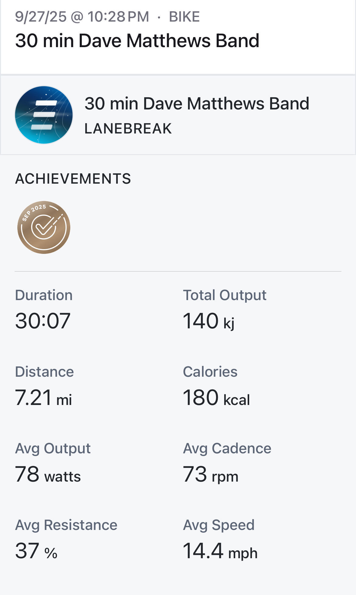 7.2 mi ride - 30 min Peloton Lanebreak Dave Matthews - Saturday, September 27, 2025