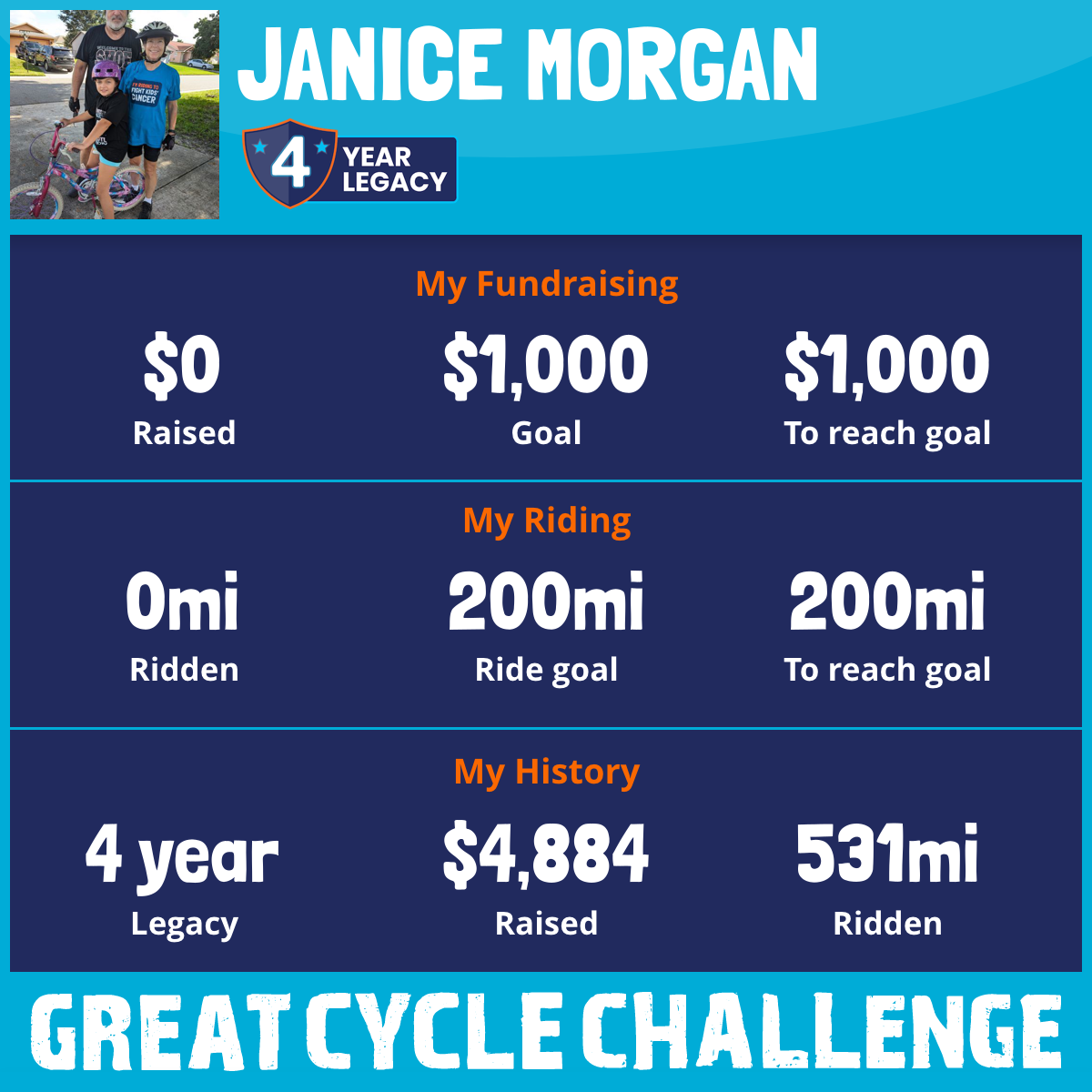 For this month of riding to be a success, I need you to support this effort by making a donation to give these kids the brighter futures they deserve. Just click the Donate Now button on my page (www.greatcyclechallenge.com/Riders/JaniceMorgan1 ) and follow the directions. Every dollar counts. If you prefer, you can give cash or checks to me and I can deposit your donation into the account and credit you on my page.