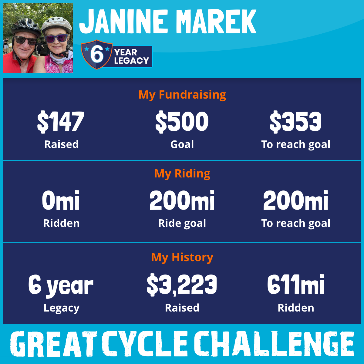 This September , I am taking part in the Great Cycle Challenge to fight cancer! I am pledging to ride 200 miles in the month of September and hope to raise alteast a $1 per mile.... $500 total. (More would be great)