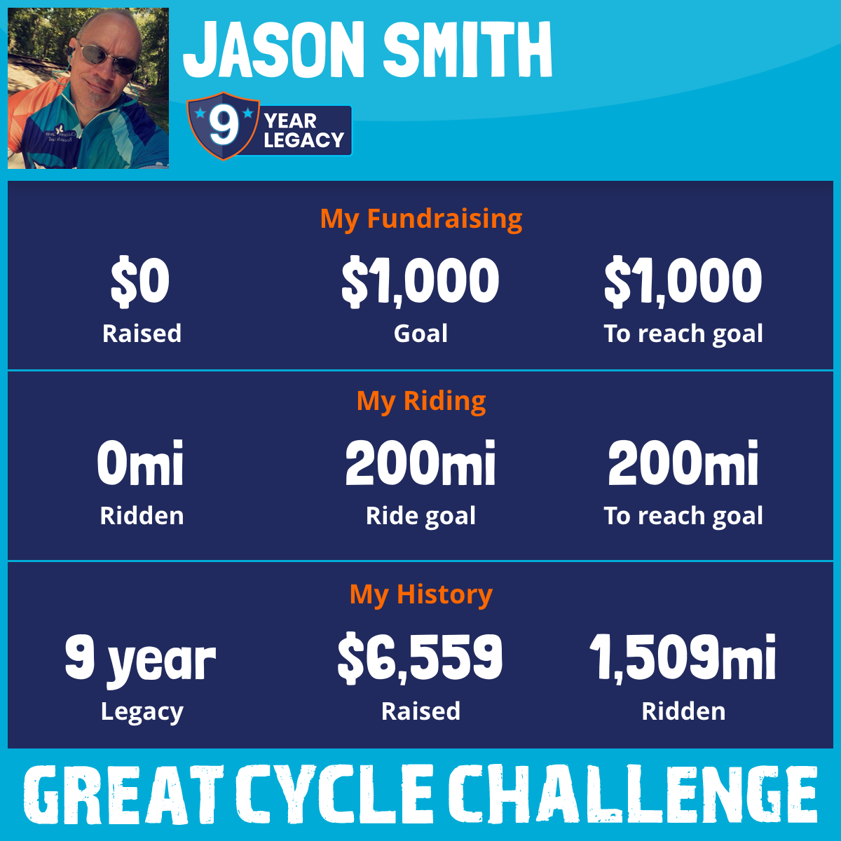 Hello, I want to start by thanking everyone who has support me and this great charity over the past 8 years. I have been blessed with a healthy child and grandchildren and when I read about this cause 9 years ago I knew I had to help where ever I could for this group of wonderful children. I have lost family and friends to cancer and have also had survivors in my family and friends has shown me you can never stop fighting. Please join me on this ride as I earn some miles and donations to help all these amazing and wonderful children who fight everyday just wanting to be on their bikes too. Thank you for all your support. Jason