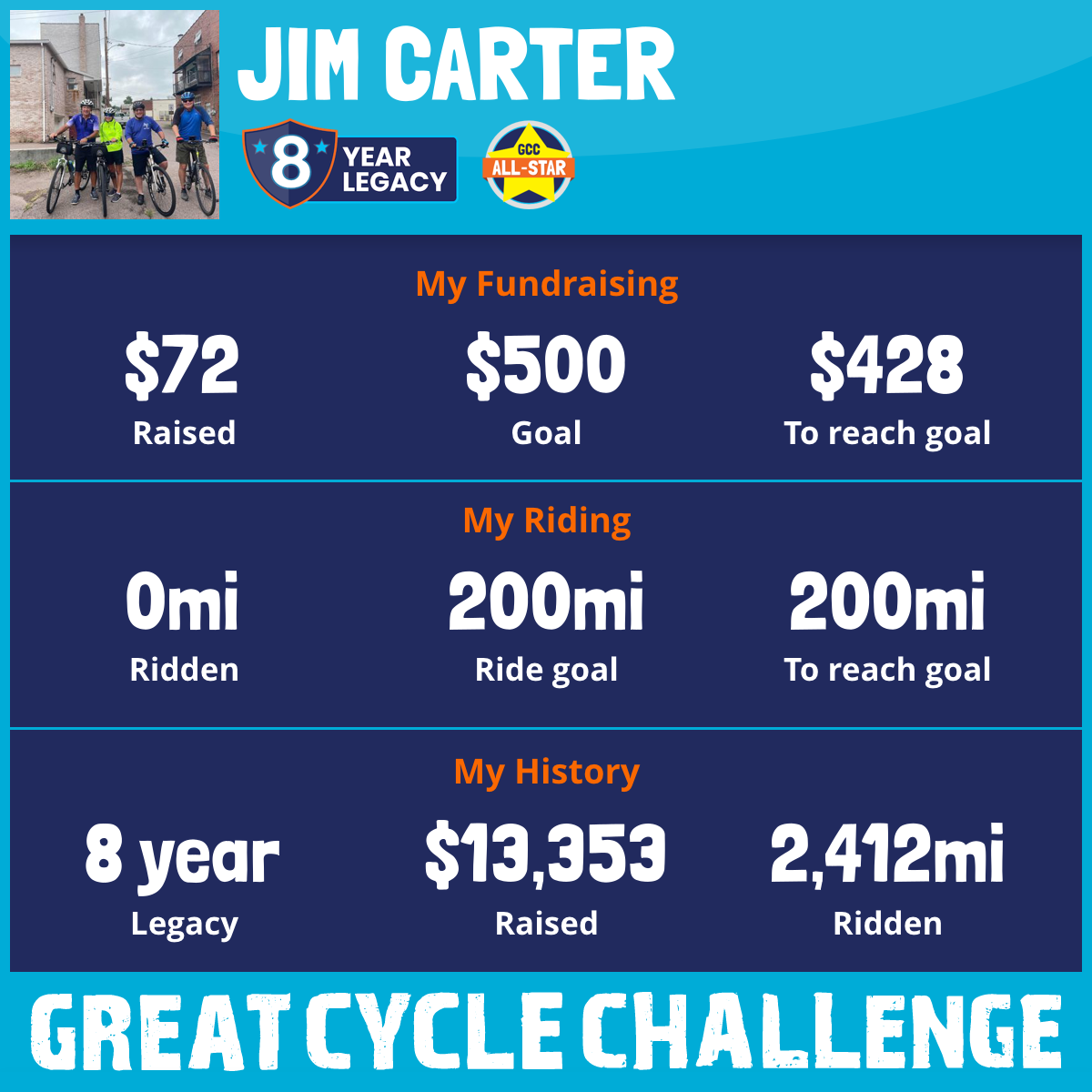 Back again for my 8th Year riding in the GCC . Will join my Spirit of 76 Team, Terry Williams and Jim and Ricki Rose. We knocked out almost 600 miles in our annual ride - this year from Columbus to Cleveland Ohio. All are Ready to battle the road for the Kids.