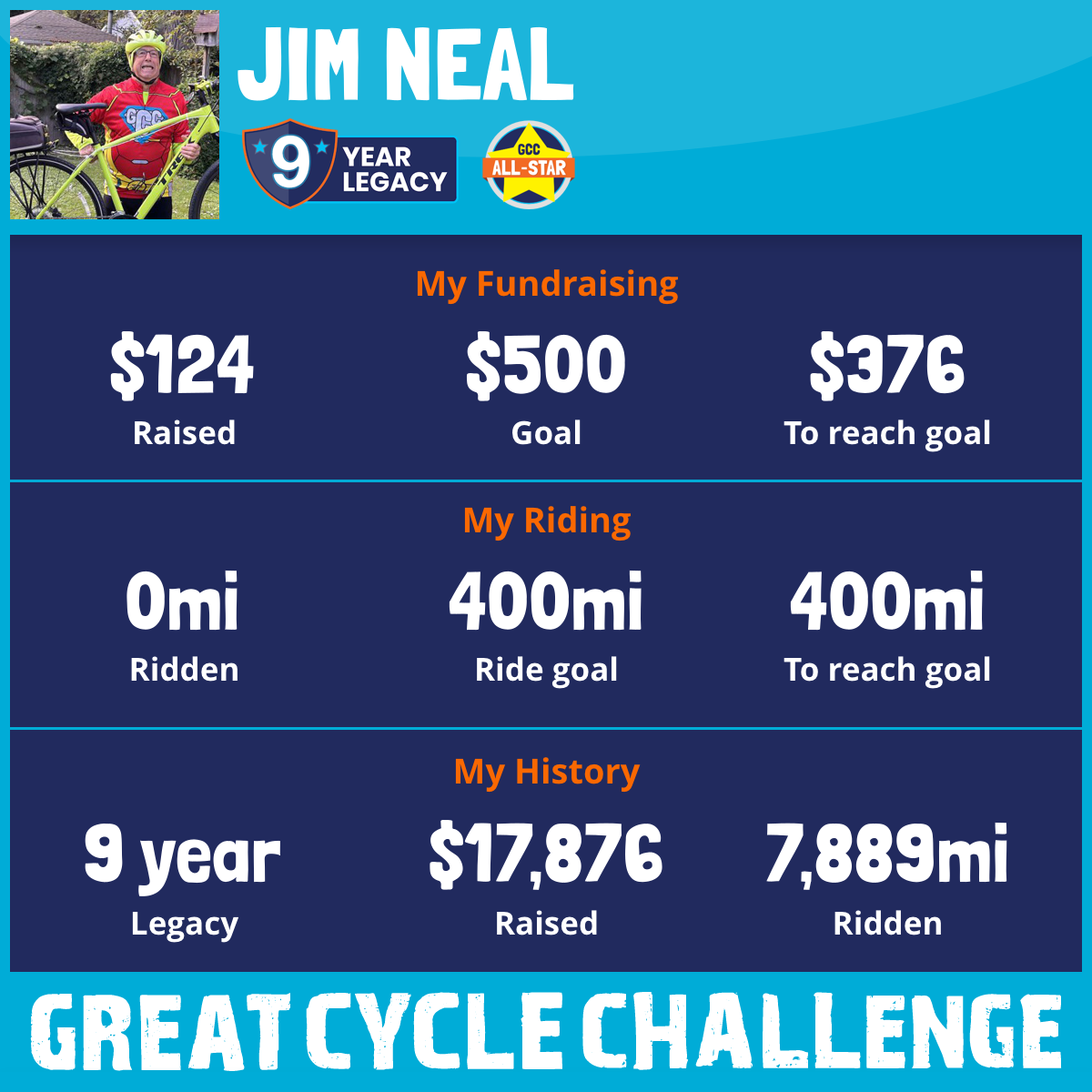 This September, I am taking part in the Great Cycle Challenge to fight kids' cancer! My wife has been fighting MGRS for over a year. The battle is endless and keeping our chins up is challenging. Janet has been a trouper. I’m proud of her strength and determination. Knowing the struggle first hand, I want to dedicate my rides to my wife, Janet.