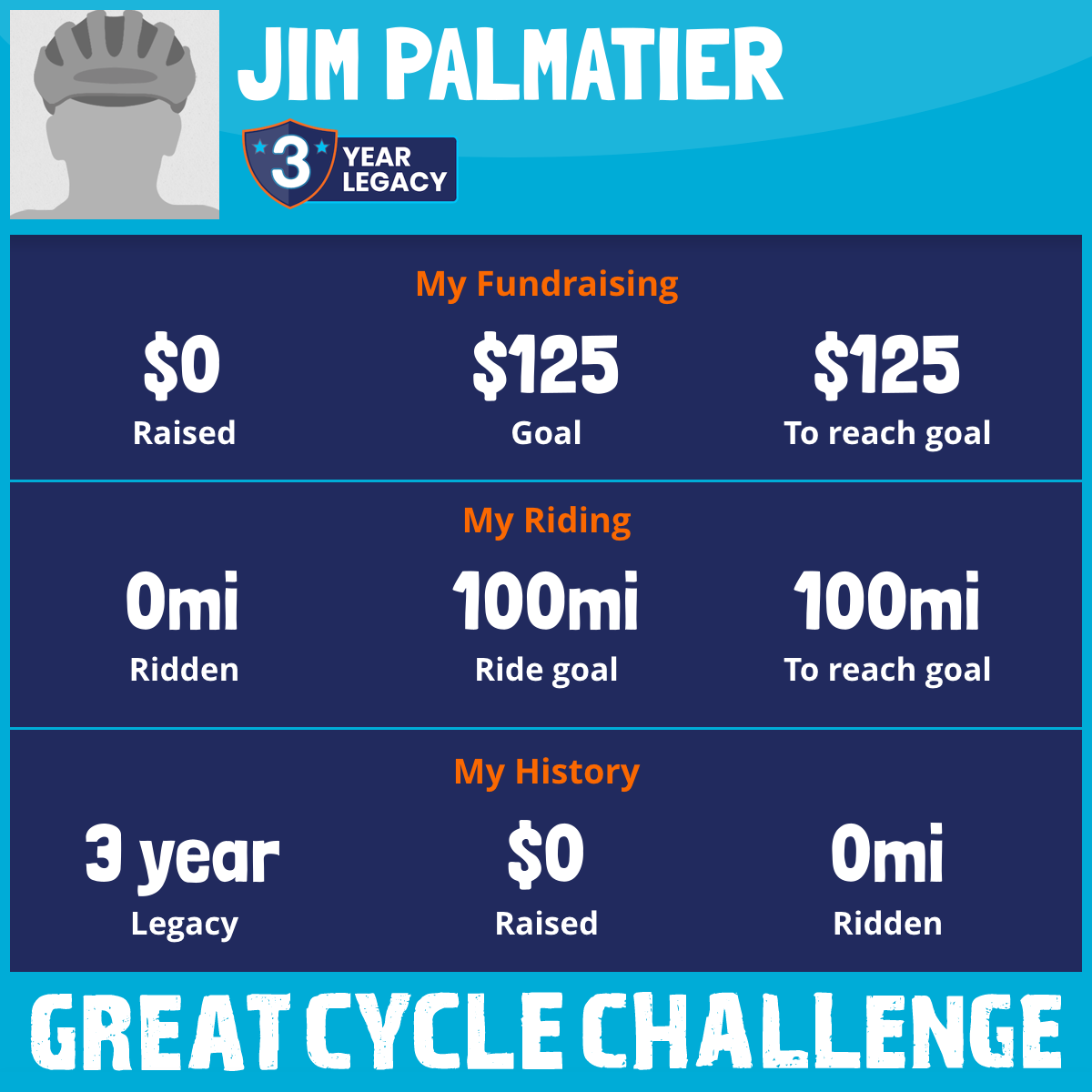 I am riding 100 mi in memory of Jacqueline Palmatier. Please sponsor me and support my challenge to fight kids' cancer and save little lives.