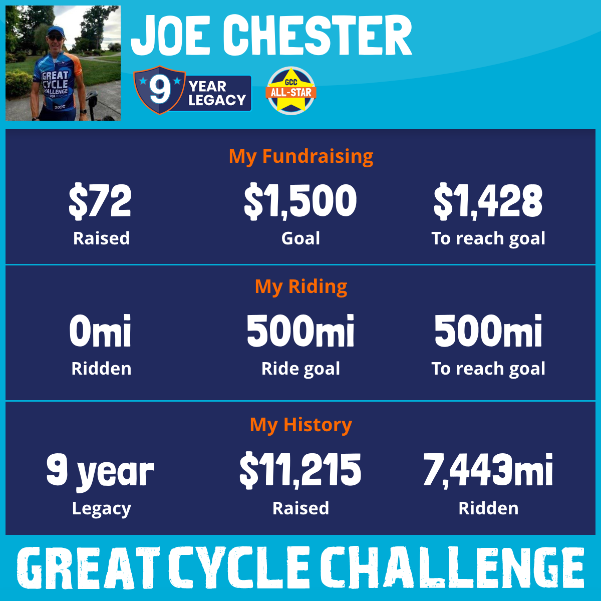 Ok..this September will be my 9th year riding in the Great Cycle Challenge to fight kids cancer. Once again I'll be spending the month riding hopefully 500 miles to raise $1500 or more for these brave kids who are fighting for their lives. Over the previous 8 years you've supported me in riding nearly 7500 miles and donating over $11,400. You all are amazing!