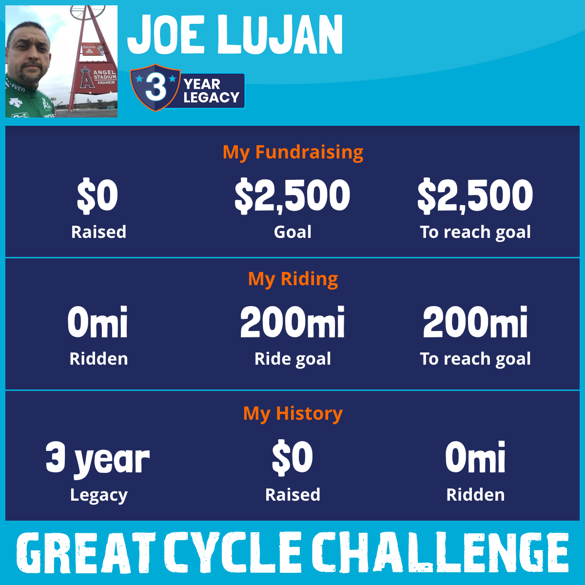I am riding 200 mi for Joe Lujan. Please sponsor me and support my challenge to fight kids' cancer and save little lives.