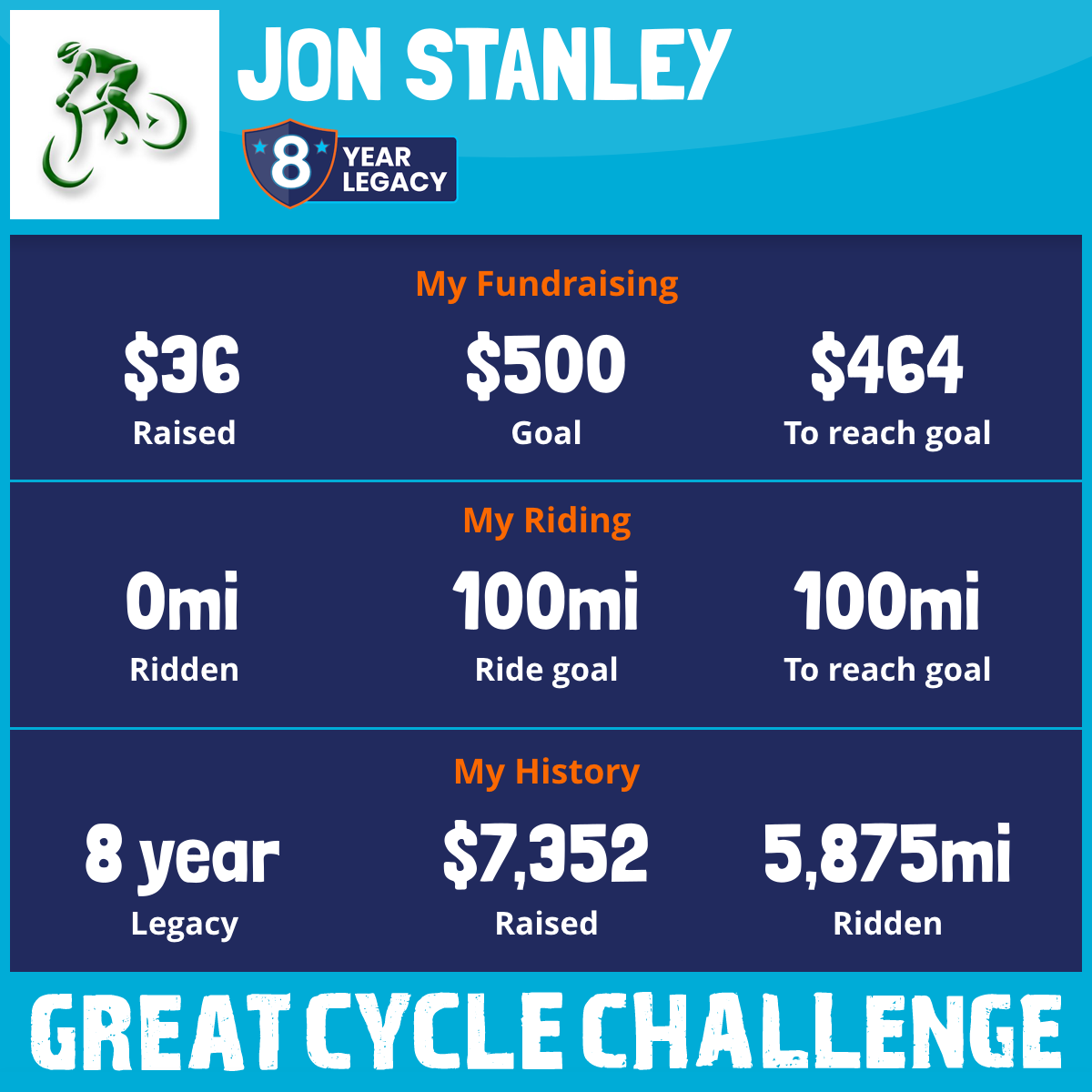 4,689 mi Ridden$1,452 Raised2018