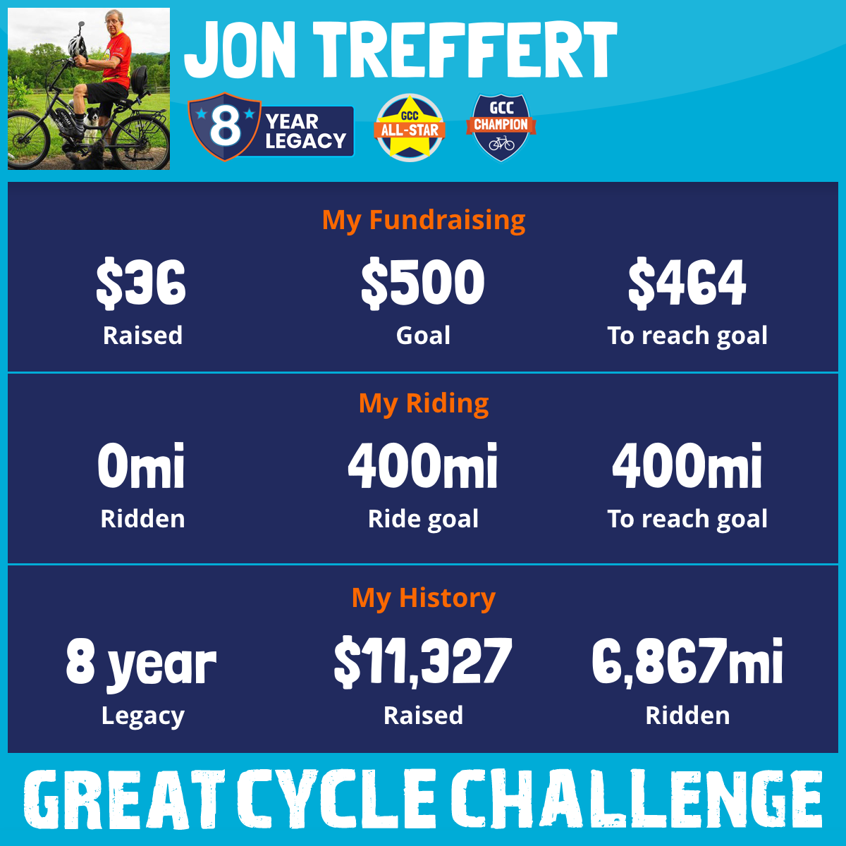 In November 2017 I was 60 years old, 267 lbs and a type II diabetic. I began a health journey with the purchase of an e-bike working up to riding 700 miles in June 2018 for my first Great Cycle Challenge. I reversed my type 2 diabetes (14 years after diagnosis) and remain 100 lbs lighter.