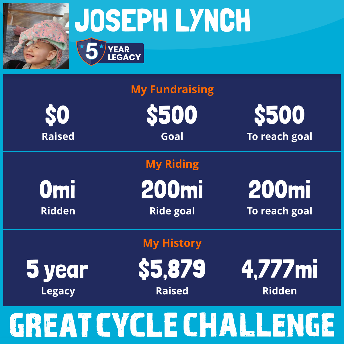 I am riding 200 mi for Mary Lynch. Please sponsor me and support my challenge to fight kids' cancer and save little lives.