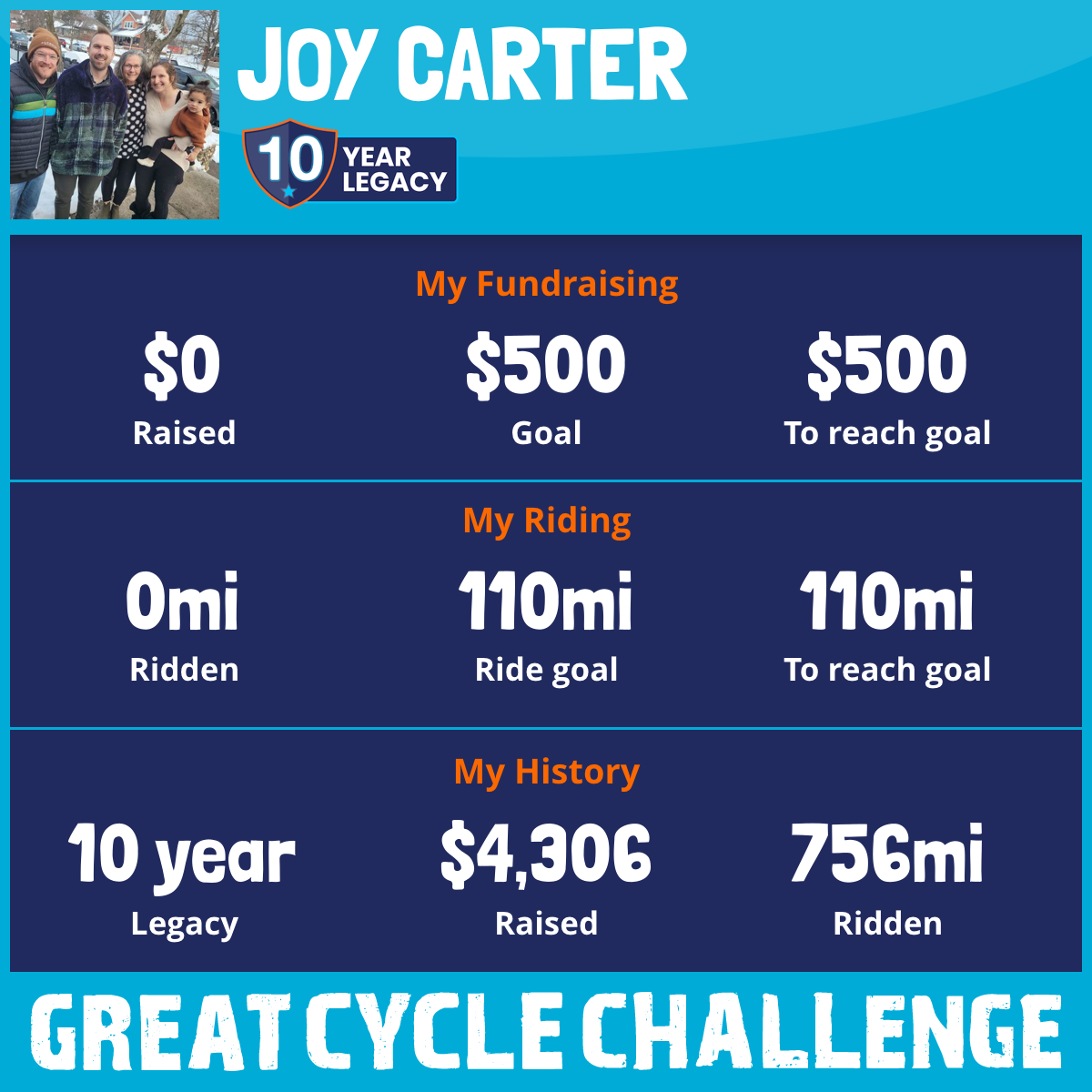 My goal this year is to ride 110 miles and raise $500. I love riding my bike and listening to praise music while doing so.