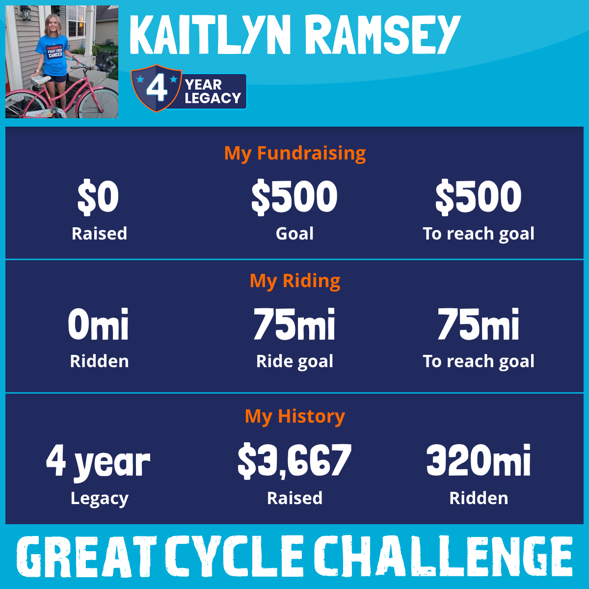Hello, my name is Kaitlyn Ramsey and I am 16 years old. This is my 4th year participating in The Great Cycle Challenge. Every year I ride in honor of Vivian Brann. All money raised goes to help find a cure to childhood cancer. It has not been easy but every year I have met those goals thanks to people like you.