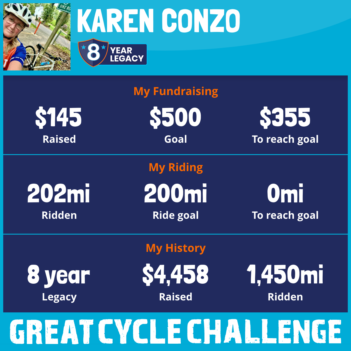 When I started this 8yrs ago, I rode in honor of a young boy named Keegan Tuma, who has battled cancer since he was a baby. He is now 18 and continues to battle and, despite the occasional setbacks, engages in his love of cooking, making meals for his family, especially for his mom, who is battling her own medical challenges. I then added my dad, Robert L. Wright, in memoriam. He was my best friend, golf coach, and "all around good-guy." Despite being given only 3yrs at the time of his diagnosis, he went on to make orchid lovers out of people in Winter Park, FL, sing to his dog, and have martinis with his wife for 8yrs. Lastly, with sorrow 2 years ago, I added my father-in-law, Nicholas F Conzo, to my "riding for" page. He stepped into the "dad" role just 6months after my dad passed and had the joy of the Pop Pop role too. He had a profound impact on many people across various walks of life. It is because of these 3 gentlemen, as well as all of the people, especially children, who bravely fight and never give up, that I ride.