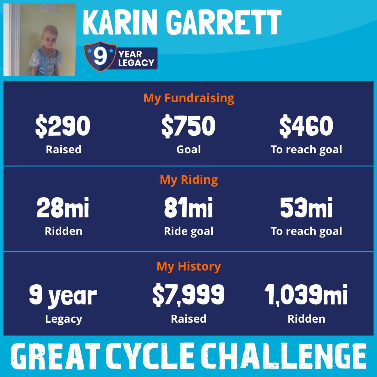I am riding 100 mi in memory of Charlotte Kelly. Please sponsor me and support my challenge to fight kids' cancer and save little lives.