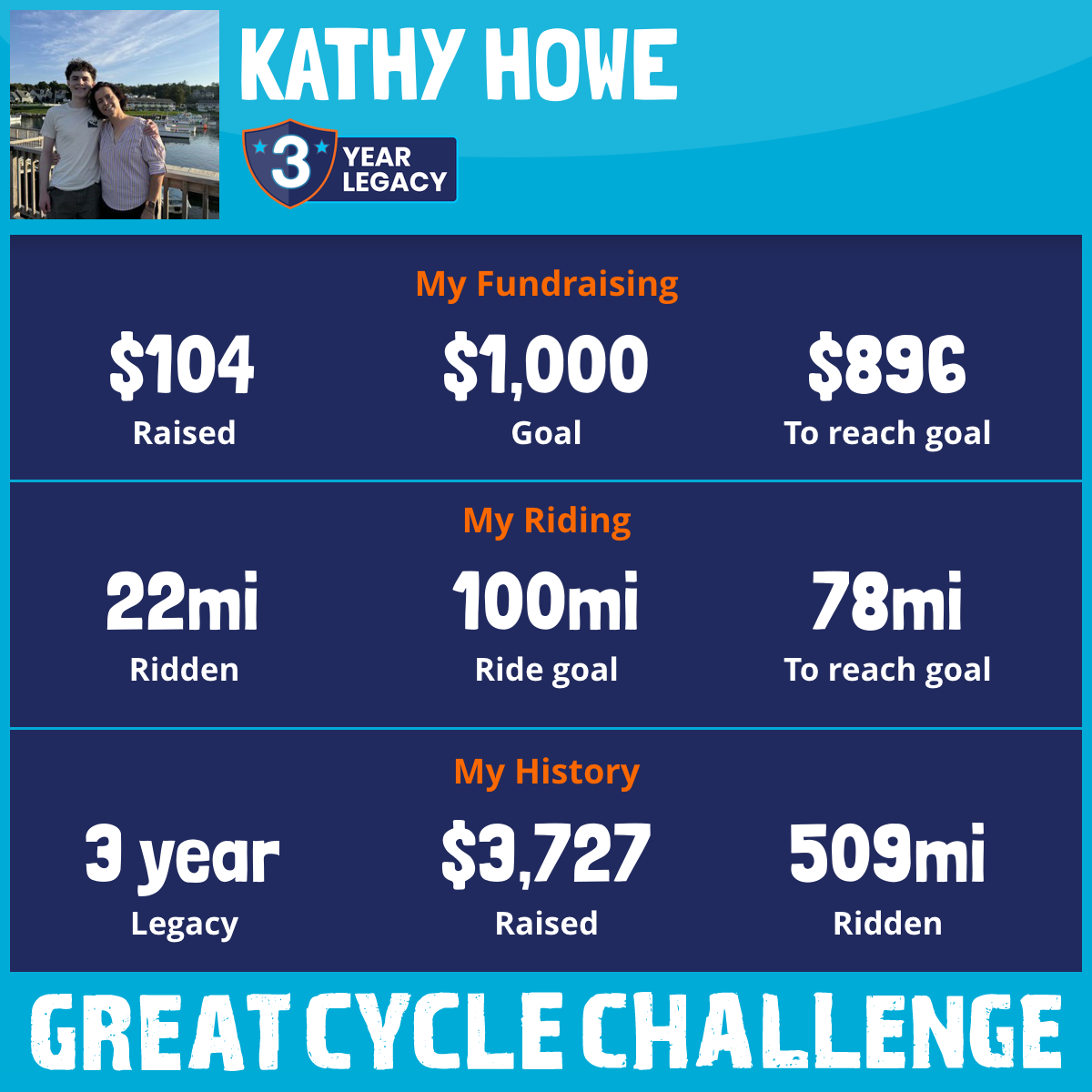 Sam is the strongest person I know. He was diagnosed with a very rare form of B Cell ALL on June 28, 2022, the summer before his junior year in high school, just after trying out and making the National Premiere League soccer team for his age group. He was as healthy and strong as he’d ever been. Now he’s even stronger. As we begin this year’s Great Cycle Challenge, Sam is starting his sophomore year at Bates College. He’s studying Economics and Chinese and he spent his summer volunteering at Lucille Packard Children’s Hospital visiting young adults who had recently been diagnosed with cancer or were receiving a stem cell transplant. He gave hope to many young people this summer. Zack and I hope to follow in his footsteps by doing this Great Cycle Challenge to raise money for research. Cancer research has been decimated and we need to keep investing so that the clinical trials, like the one that saved Sam’s life, continue. Thank you for donating!