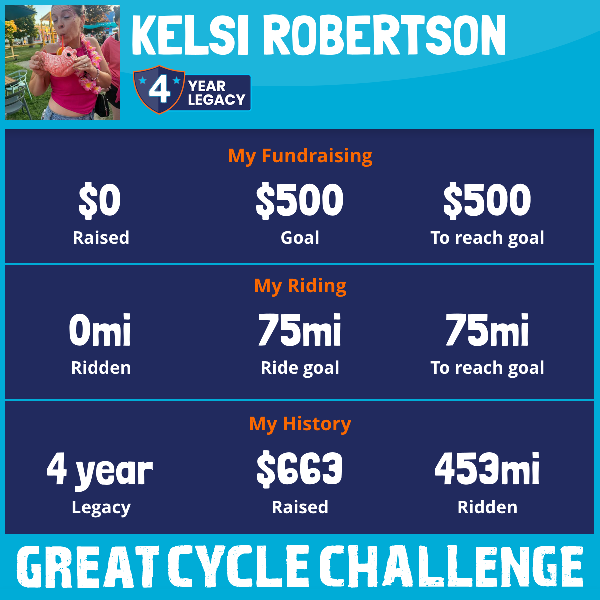 3 years ago I was introduced to this challenge in support of Chad Carr and the countless number of children affected by kids' cancer. This September, I am once again taking part in the Great Cycle Challenge to fight kids' cancer!